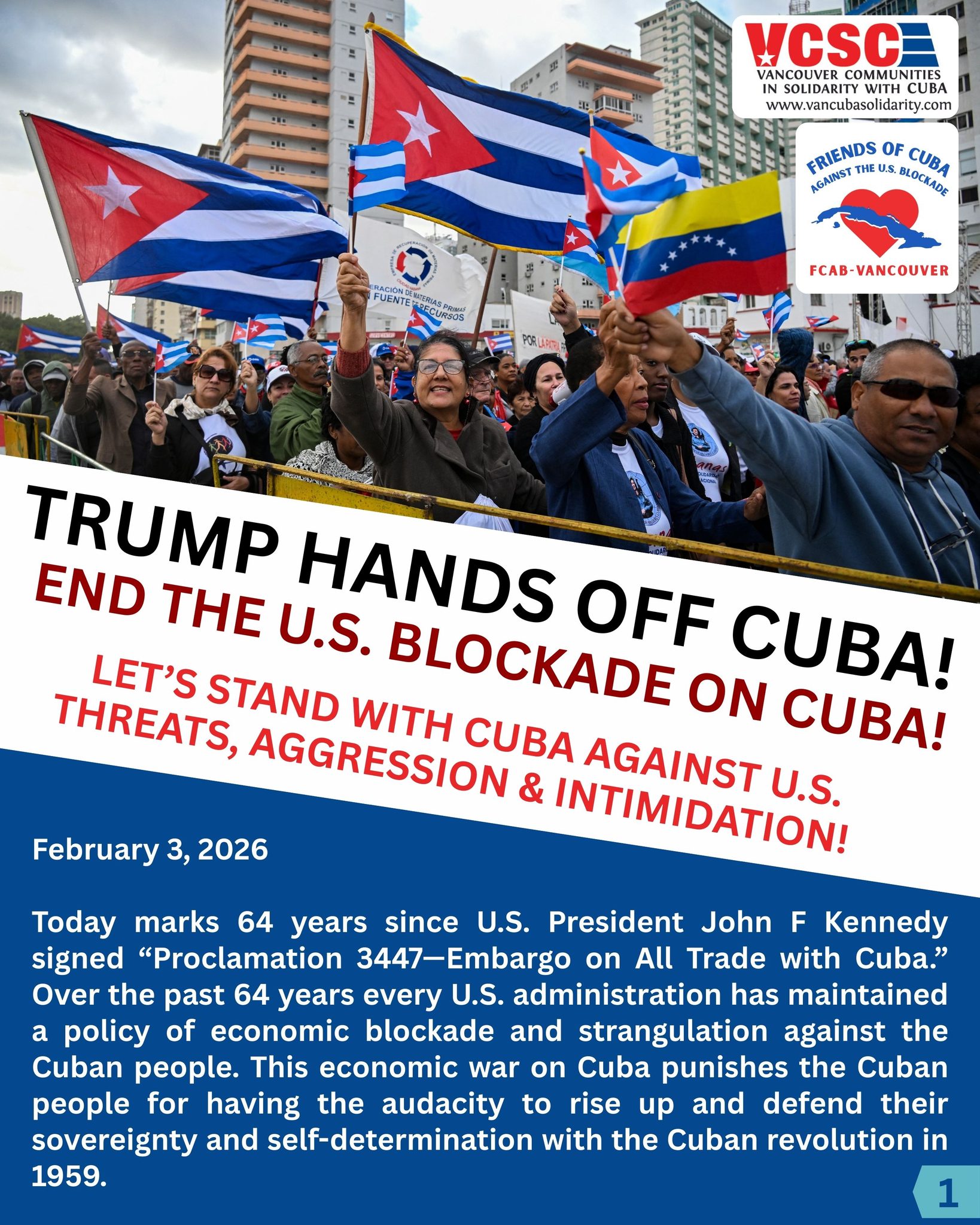 Organized by: Friends of Cuba Against the U.S. Blockade - Vancouver In Solidarity with: Maratón Mundial de Amor por Cuba & Puentes de Amor Sponsored by: Vancouver Communities in Solidarity with Cuba – VCSC, Vancouver Communist Party of Canada Marxist-Leninist, Supporters of the Communist League in Vancouver, Fire This Time Movement for Social Justice – Vancouver, Mobilization Against War & Occupation (MAWO) – Vancouver January 7, 2026 Banner Drop Action Stop The War On Venezuela! U.S. Release Pres. Maduro & Cilia Flores Now! Organized by: Fire This Time Movement for Social Justice - Venezuela Solidarity Campaign Endorsed by: Mobilization Against War and Occupation(MAWO), Canada-Wide Peace and Justice Network(CWPJN), Metro Vancouver United for Palestine (MVUP), Vancouver Communities in Solidarity with Cuba(VCSC), Friends of Cuba Against the U.S. Blockade - Vancouver(FCAB-Vancouver) January 5, 2026 Emergency Action! Stop The War On Venezuela! U.S. Release Pres. Maduro & Cilia Flores Now! Organized by: Fire This Time Movement for Social Justice - Venezuela Solidarity Campaign Endorsed by: Mobilization Against War and Occupation(MAWO), Canada-Wide Peace and Justice Network(CWPJN), Metro Vancouver United for Palestine (MVUP), Vancouver Communities in Solidarity with Cuba(VCSC), Friends of Cuba Against the U.S. Blockade - Vancouver(FCAB-Vancouver) December 19, 2025 Vigil To End The U.S. Blockade on Cuba
